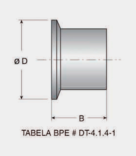 Niple Tri Clamp Médio (DT-4.1.4-1B) em aço inoxidável ASTM A276/A479/A511 TP-316L (UNS#31603), sem costura. Uma extremidade plana e prolongada para solda manual (não há extensores soldados). Uma extremidade Tri-Clamp ISO 2852. Acabamentos de superfície possíveis: polimento mecânico interno RA <= 0,51 micrômetros (SF1) ou polimento mecânico seguido de eletropolimento interno RA <= 0,38 micrômetros (SF4). Acabamento externo polido mecanicamente (SF3). Espessura da parede 1,65 mm. Dimensões, tolerâncias e acabamento de acordo com a norma ASME-BPE. Niples com diâmetros menores (1/4" a 3/4") são fornecidos sem costura.